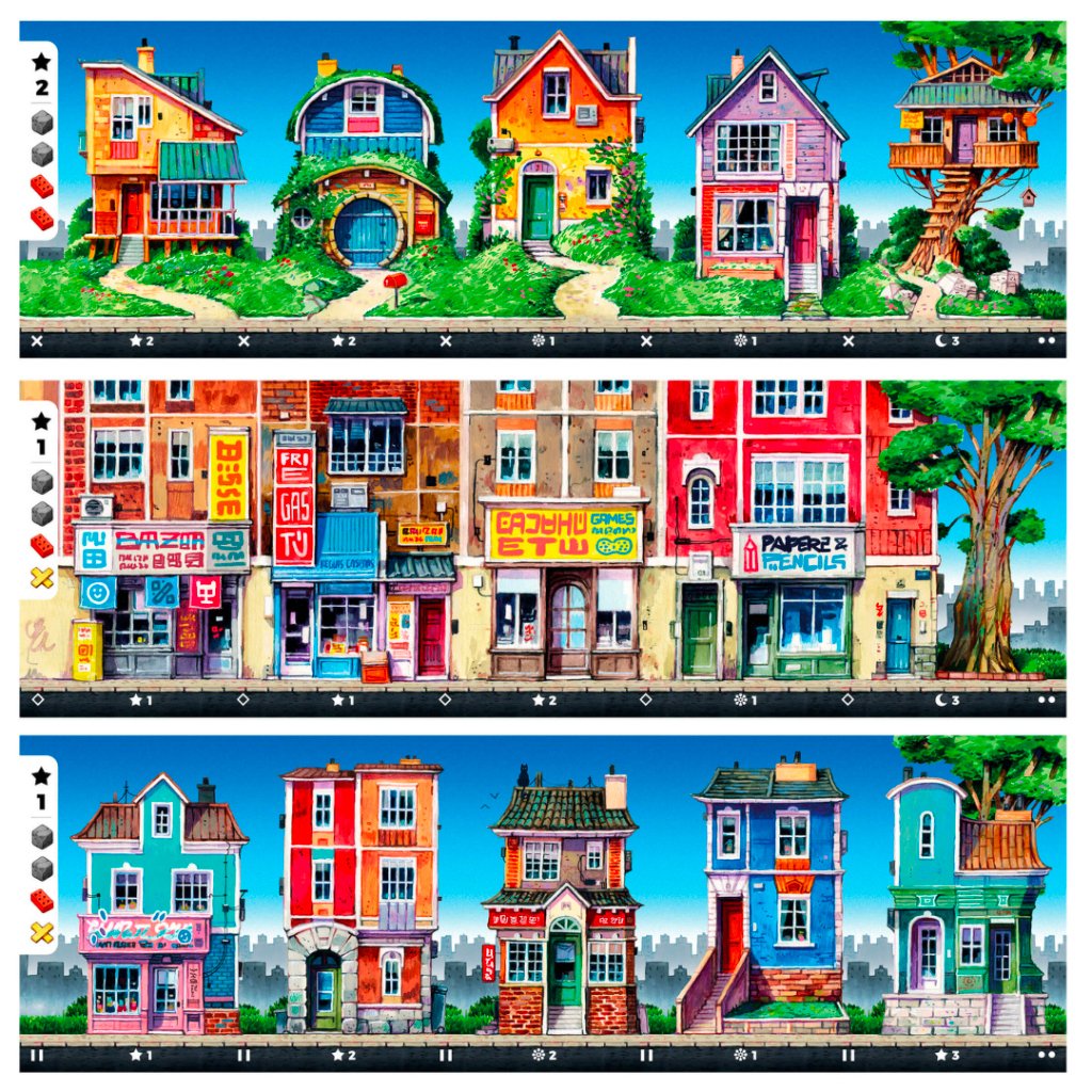Vale la pena destacar que el juego tiene una arte excepcional pues las ilustraciones hechas por el mismo autor del juego Jorge Tabanera Redondo muestran un amor enorme donde cada carta es distinta y con una gran cantidad de detalles y colores que hacen visualmente atractivo el juego es especial cuando se van formando las panorámicas de las casas.