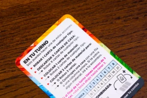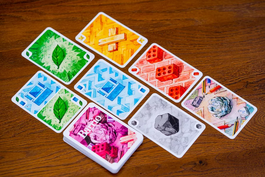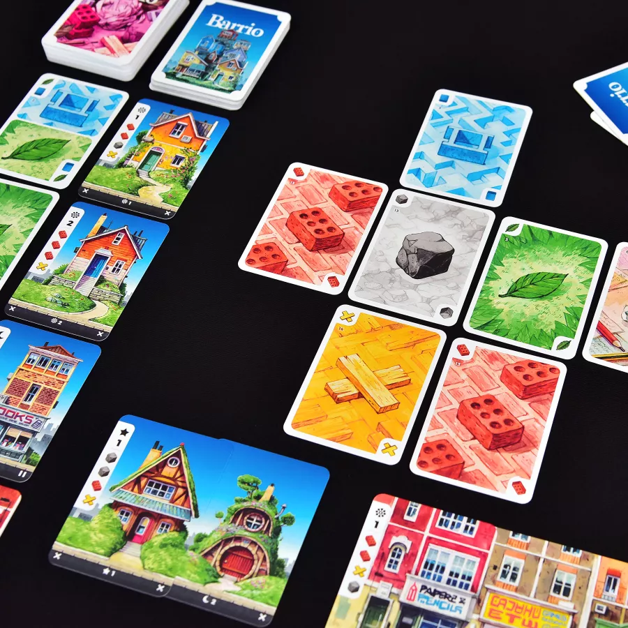 Barrio tiene una mecánica interesante al momento de querer construir nuestras casas y es que para construir los edificios primero primero tendremos que mandarlos al dejándolos a disposición de todos demás jugadores. Así, cuando tomemos de nuevo nuestro turno, tenemos la posibilidad de tomar los materiales para construir nuestra casa o puede ser que previamente hayan utilizado la fila o columna que requeríamos y de nuevo sea necesario agregar mas materiales al mercado. Convertido así al mercado de materiales el elemento fundamental del juego ya que colocar cartas en el te va a permitir, por un lado, darle movimiento a tu mano en busca de nuevos materiales o casas y, por otro, ir preparando conjunto de materiales para poder construir.